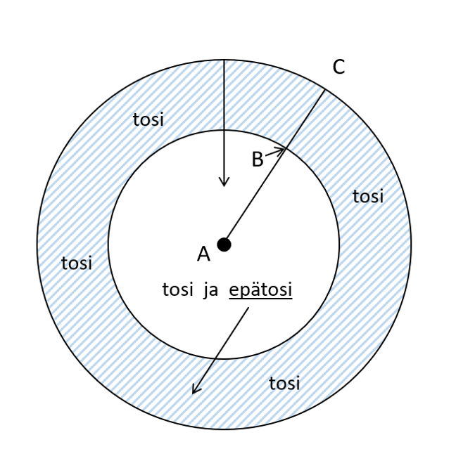 Therefore, consequently the circle BA disappears and transforms (BA → (CB)) to different (sized), by their ”truths” compatible, groups of true propositions. Each group is ”.. a model of the reality ..” (2.12 , 4.01). They exclude each others. These sets, groups of true propositions, are due to their logical natu-re ”anumerical” (4.0312 , 4.128 , 6.4321), uncountable. They cannot be enumerated with any (general) method of logic.